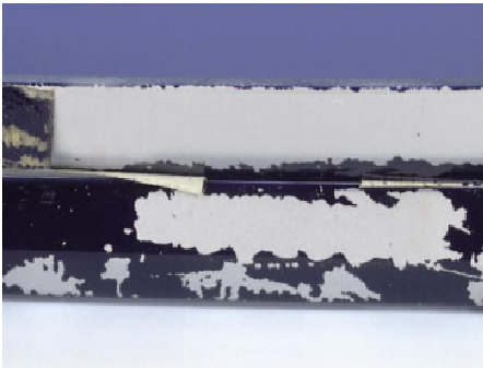 Покрытие отслаивается от поверхности. Хлопья легко крошатся с тенденцией загибания краев.